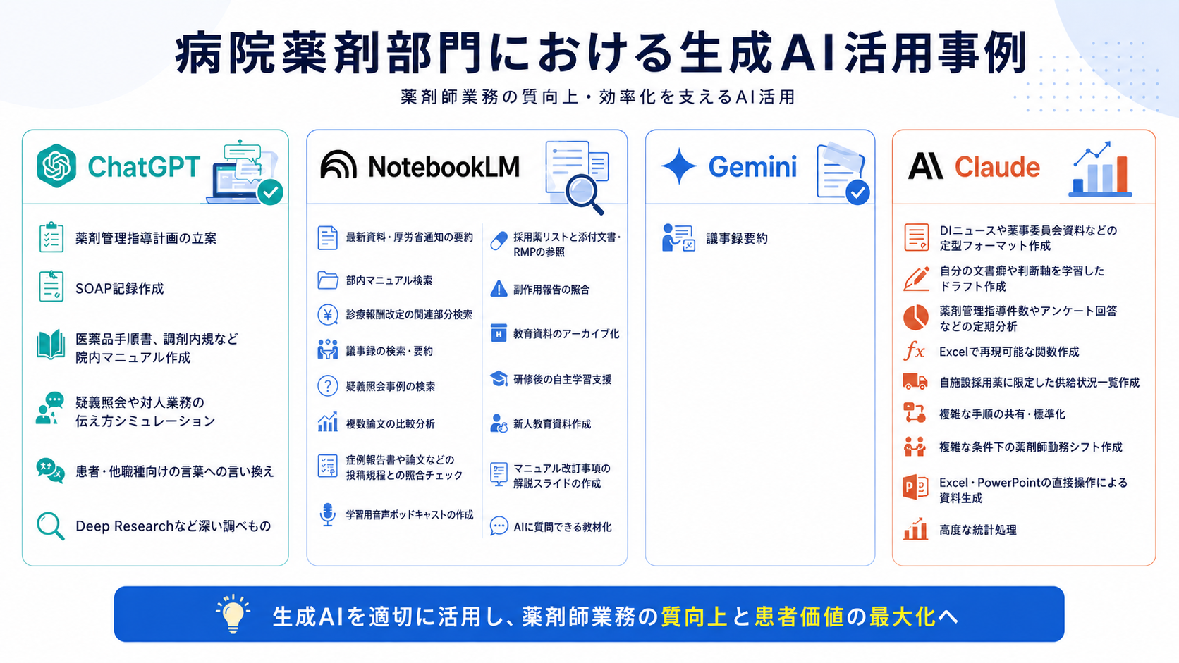 近年、生成AIの活用は急速に広がっていますが、病院薬剤部門においては「何に使えるのか」「どこまで業務に活用できるのか」が具体的にイメージしづらいという声も多くあります。