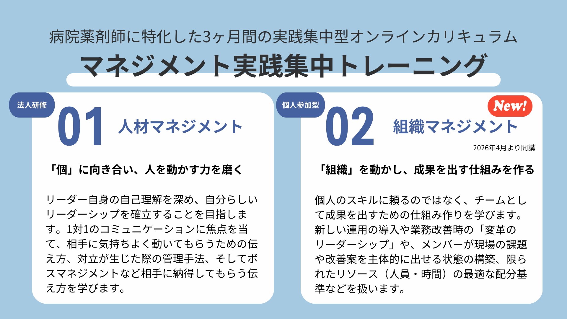 2026年4月より、人材マネジメント実践集中トレーニングに加え、病院薬剤部門における組織マネジメントを扱うプログラムを新たに開始いたします。